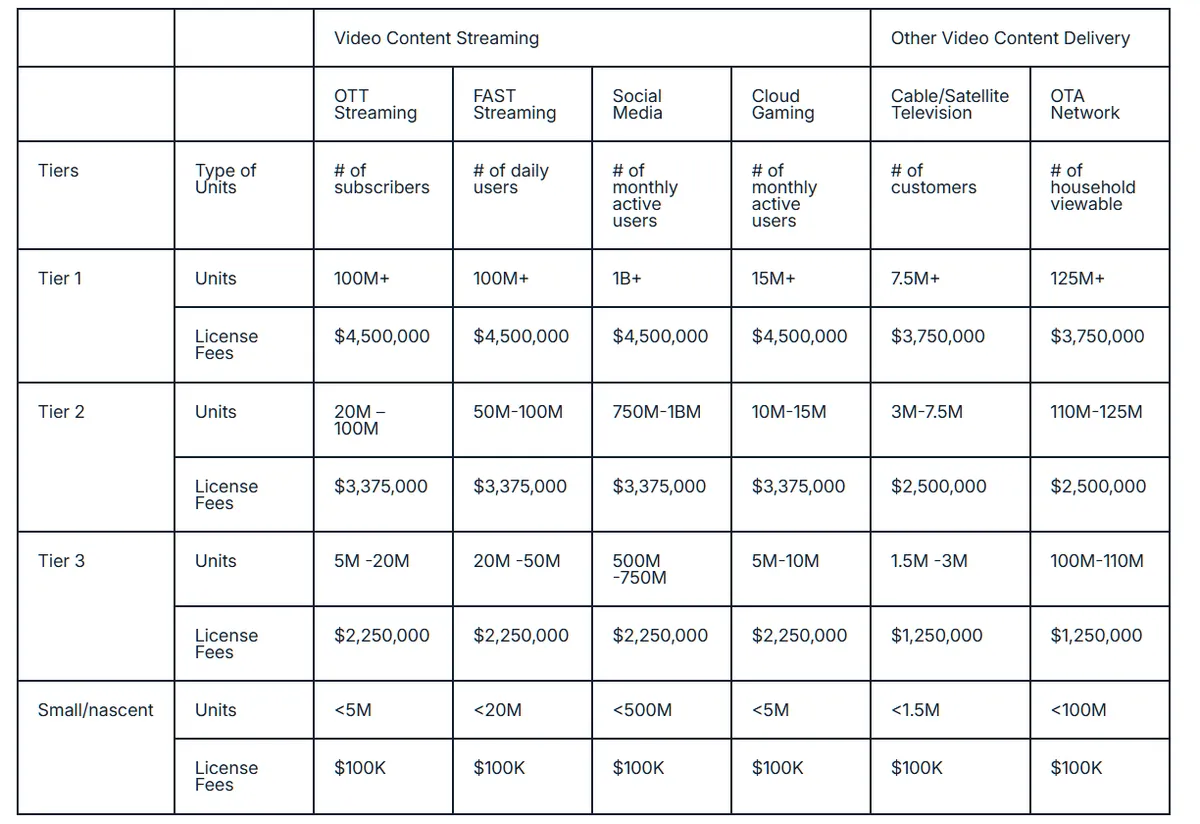 Hopefully the Licensing Alliance never ever ever gets another customer ever again. Hopefully no one uses any of their new encodings. This is an untrustworthy company, that always have been out to fleece the industry and hold back humanity. Licensing Alliance embodies Lawful Evil, is a stain on the patent system as a whole. It's hard to find the words for how awful, how enraging this cabal is. Ugh. What an evil drain.